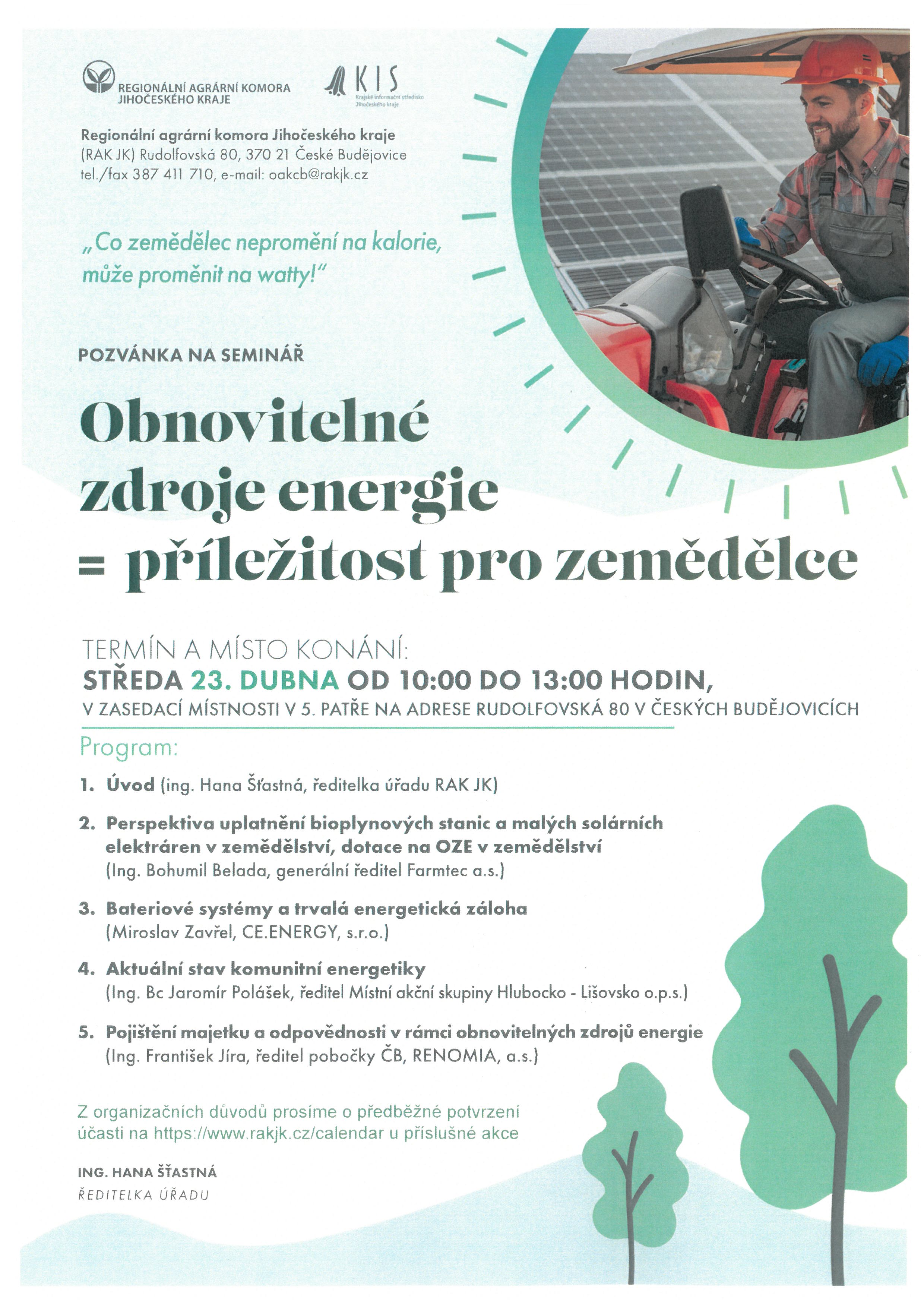 Obnovitelné zdroje energie = příležitost pro zemědělce - Pozvánka na seminář