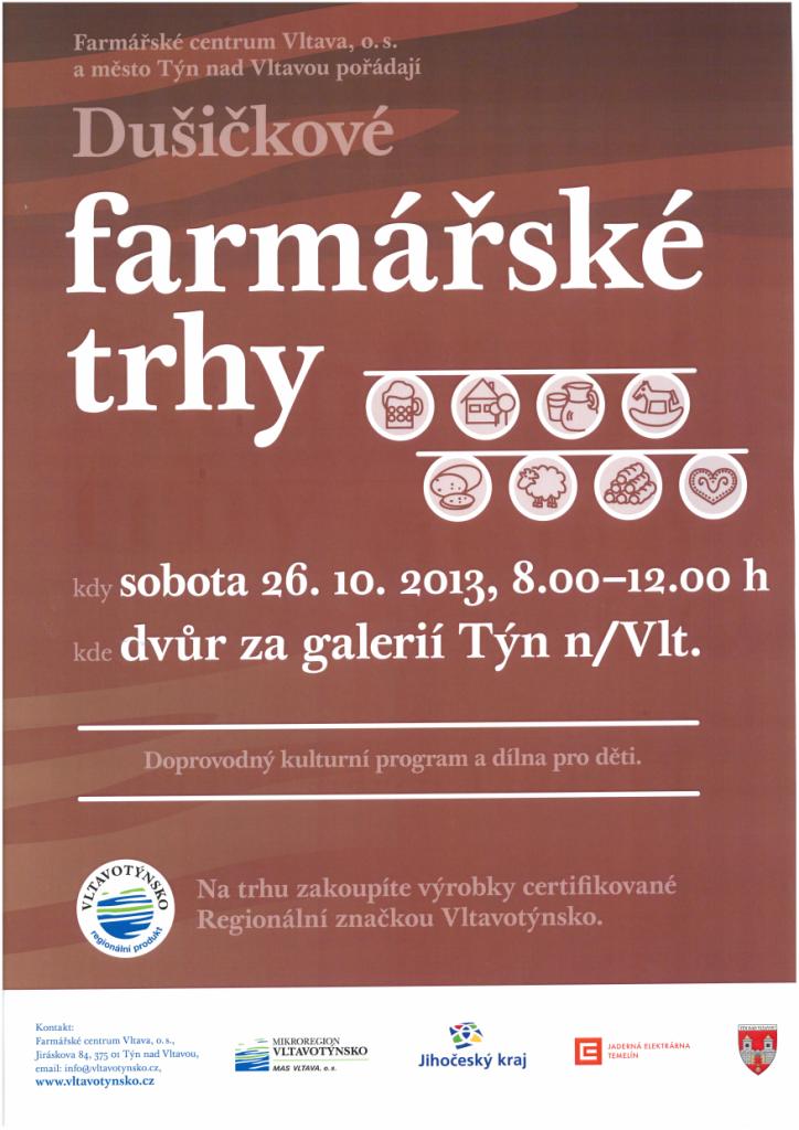 V sobotu 26.10.2013 se od 8 do 12 hodin konají tradiční Dušičkové farmářské trhy. V příloze naleznete plakát s podrobnějšími informacemi. Těšíme se na setkání s Vámi!